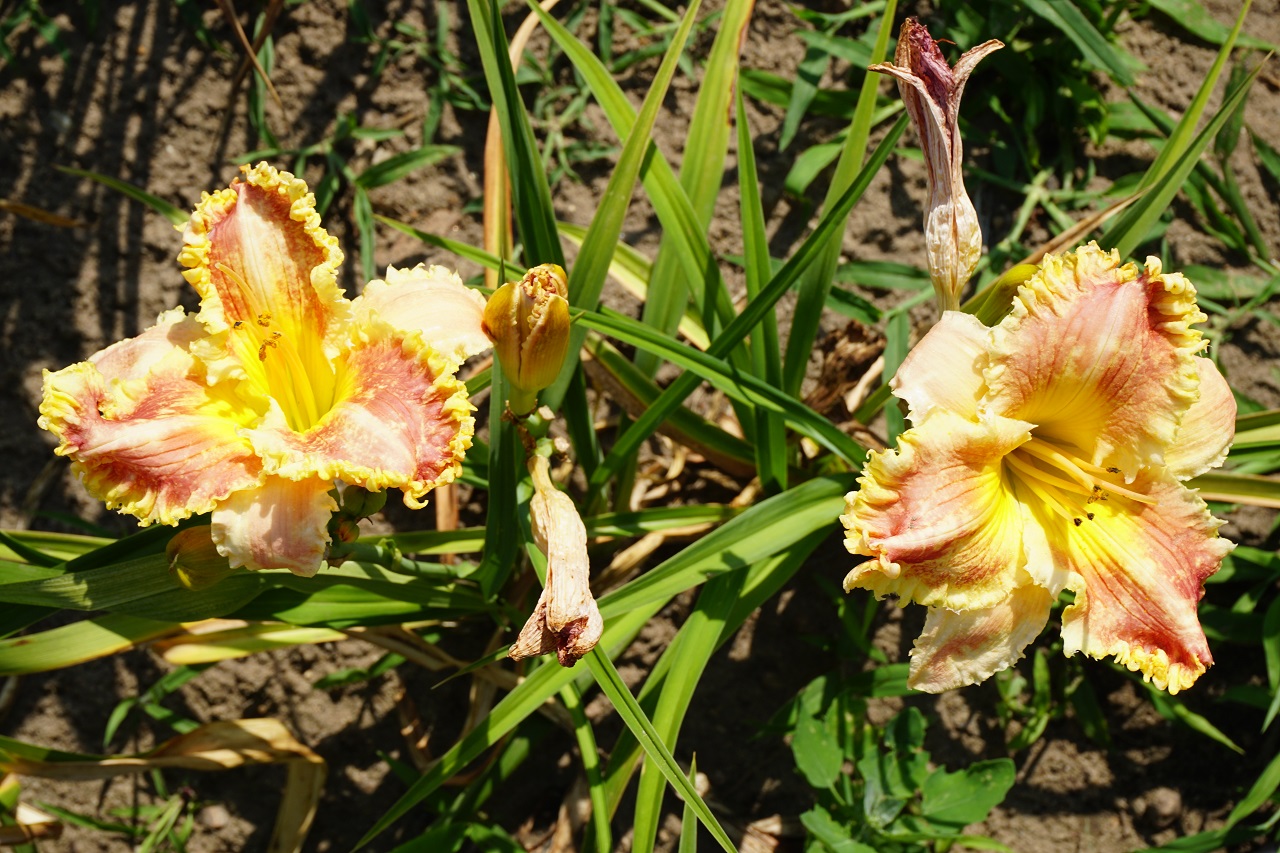 Kolor kwiatu: Czerwono-pomarańczowy dwubarwny ze złotozielonymi marszczeniami na płatkach i różowymi działkami o postrzępionych krawędziach